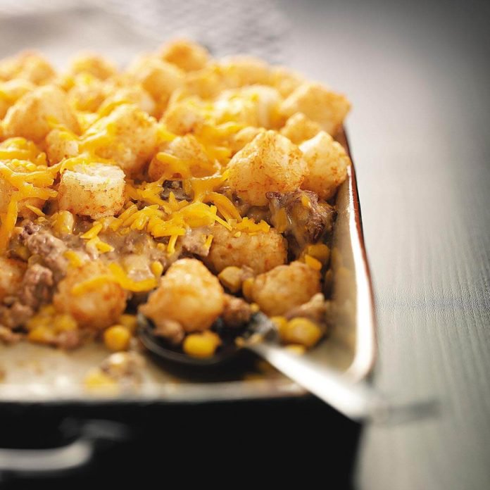 4. Top with browned tater tots and bake for 20-30 minutes until bubbly and hot.  Top with cheese if desired.