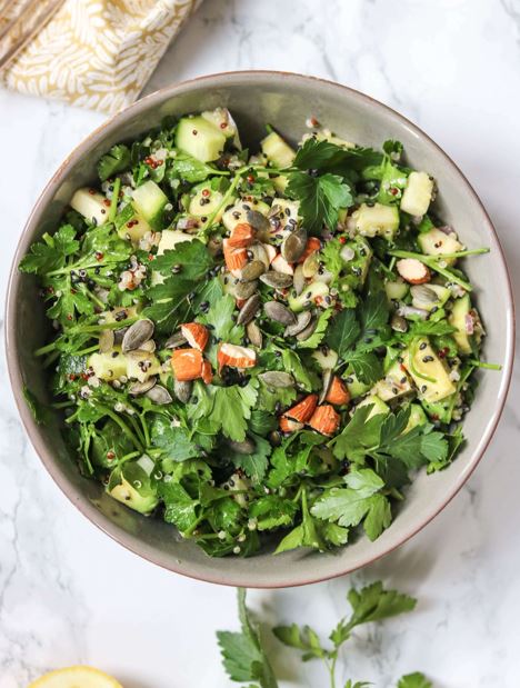 2. Combine: In a medium bowl, toss together the parsley, avocado, quinoa, cucumber, zucchini, and onion.
