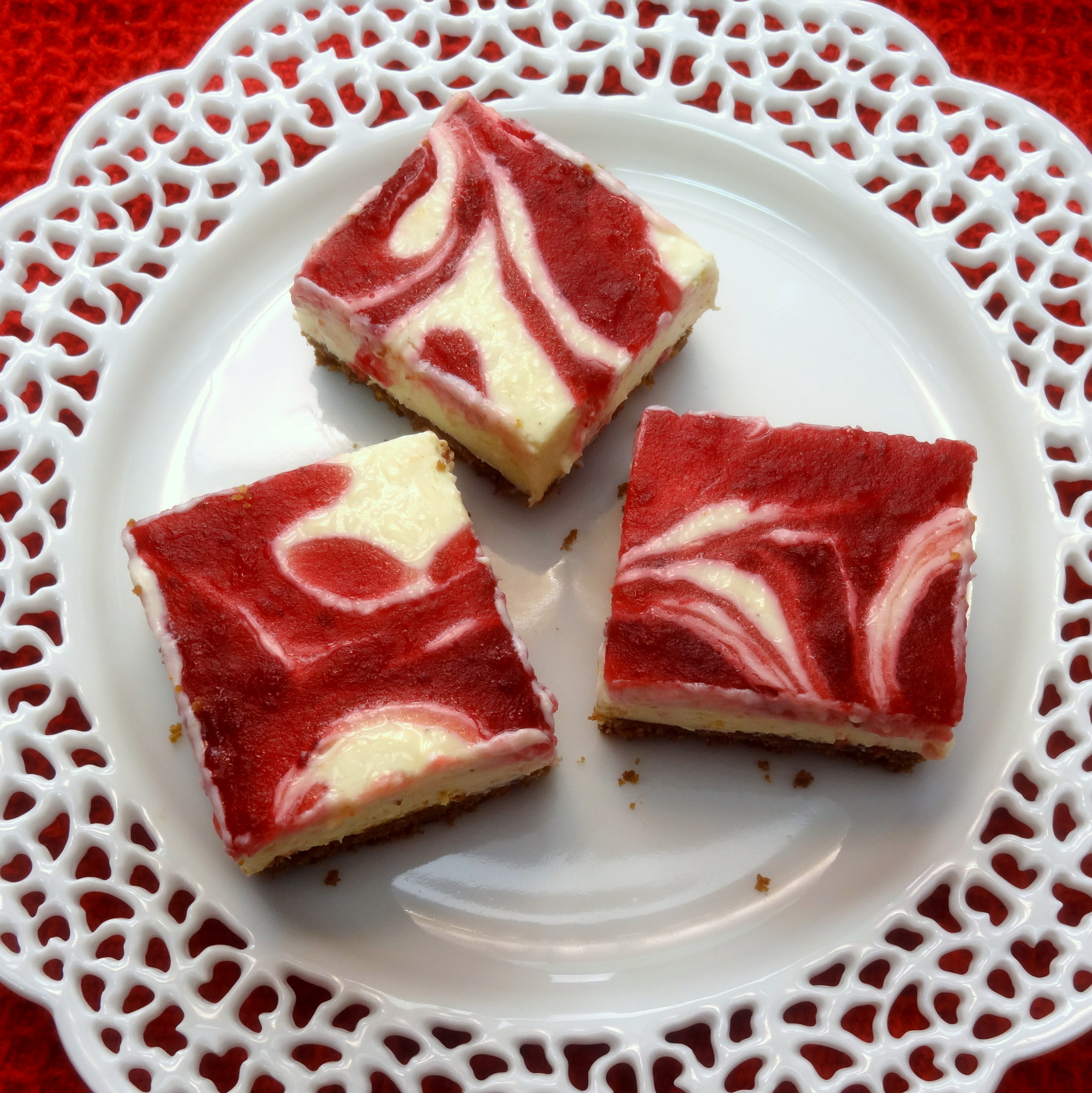 Bake the cheesecake in the preheated oven for 25 minutes. Allow the cheesecake to cool to room temperature, and place in the fridge for several hours to get well chilled. Once chilled, cut into squares and serve.